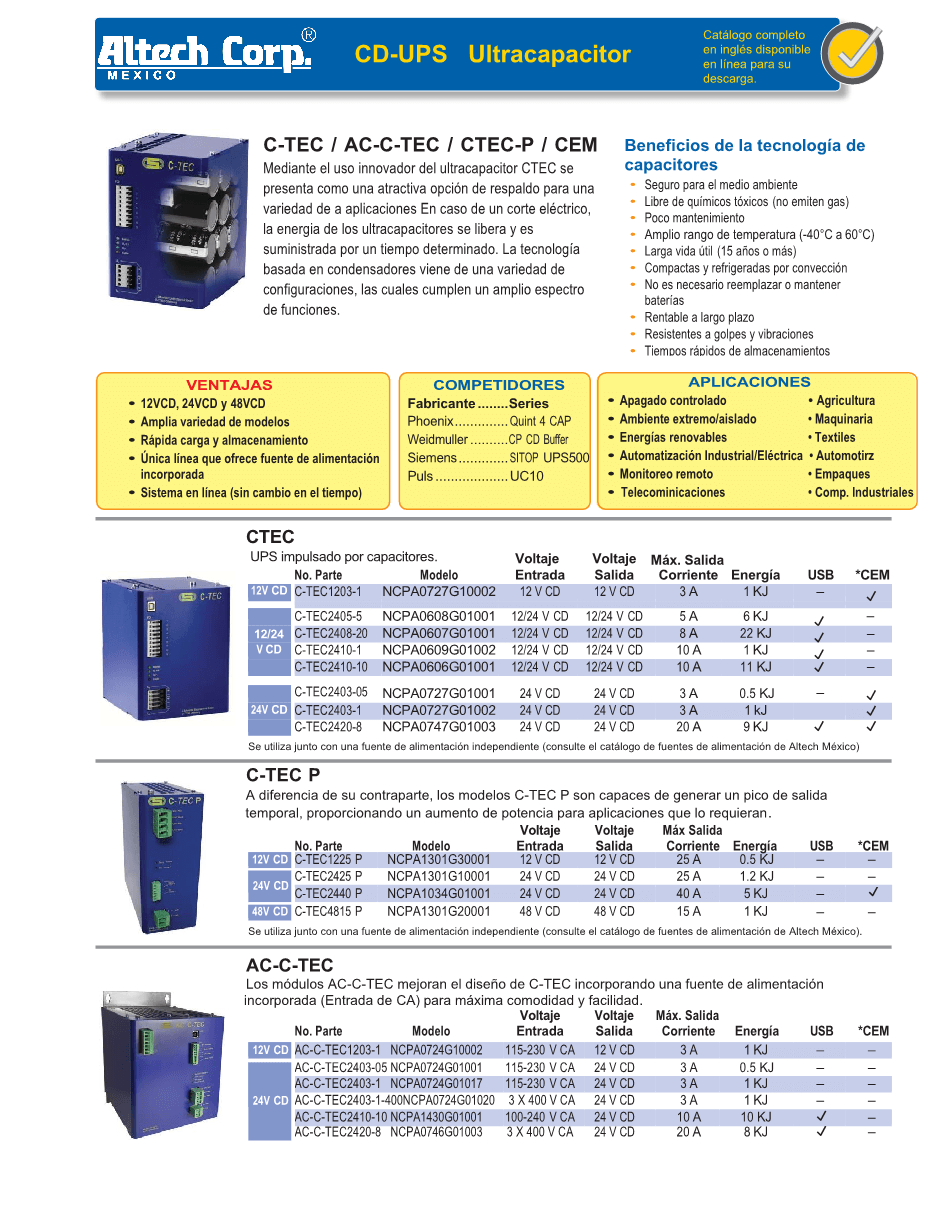 Los módulos de respaldo de corriente continua (DC Back-Ups) de Altech Mexico utilizan ultra capacitores como una forma innovadora de almacenar energía en un diseño compacto. En caso de una interrupción del suministro eléctrico principal, se libera la energía almacenada en los ultra capacitores. La carga es alimentada desde el módulo de almacenamiento hasta que este se descarga.