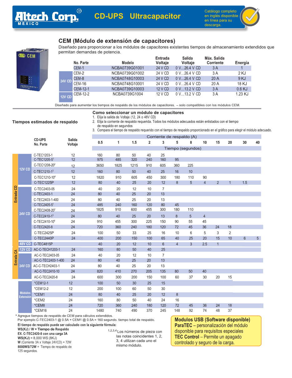 Los capacitores son excelentes para el control de apagado ofreciendo protección de los sistemas informáticos. Los tiempos de respaldo dependen de la carga y de la cantidad de capacitores dentro de la unidad. Los tiempos de respaldo pueden ser calculados conforme a sus requerimientos.